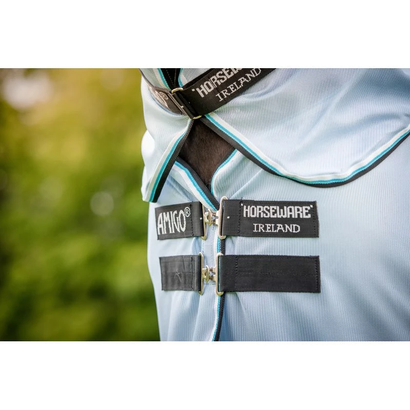 Keep insects from annoying your horse with the Bug Rug. Made in silver knitted polyester fabric with sun reflecting properties to keep the coat from fading, front leg arches, classic front closure, shoulder and mane lining, cross surcingles, supersized tail flap, and a removable neck cover for extra coverage.