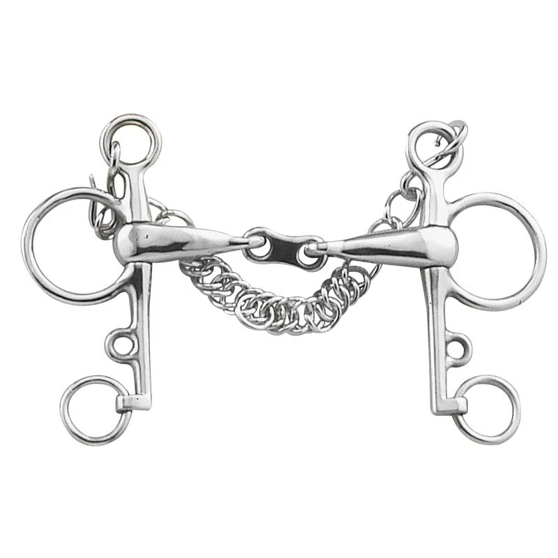 Featuring 5″ cheeks, the French Link Pelham is also designed with a French Link mouthpiece. Each side of the bit is perfectly balanced to assure total comfort and response. Lost wax cast and hand polished from the highest grade of 18/8 Stainless Steel. Lifetime guarantee against rust.