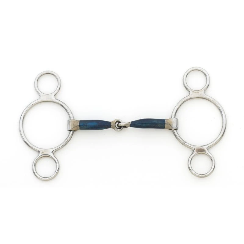 The Jointed 2-Ring Blue Steel Gag is made from Centaur’s technologically advanced version of Black Steel (traditional Sweet Iron). Blue Steel oxidizes faster and easier compared to Black Steel. It will rust when in contact with air and humidity. This surface rust tastes sweet and naturally stimulates additional saliva production, encouraging better acceptance of the bit by the horse.