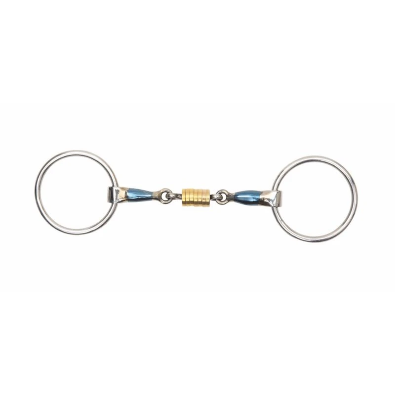 This bit features loose rings cheeks and a multi-link mouth with roller center.