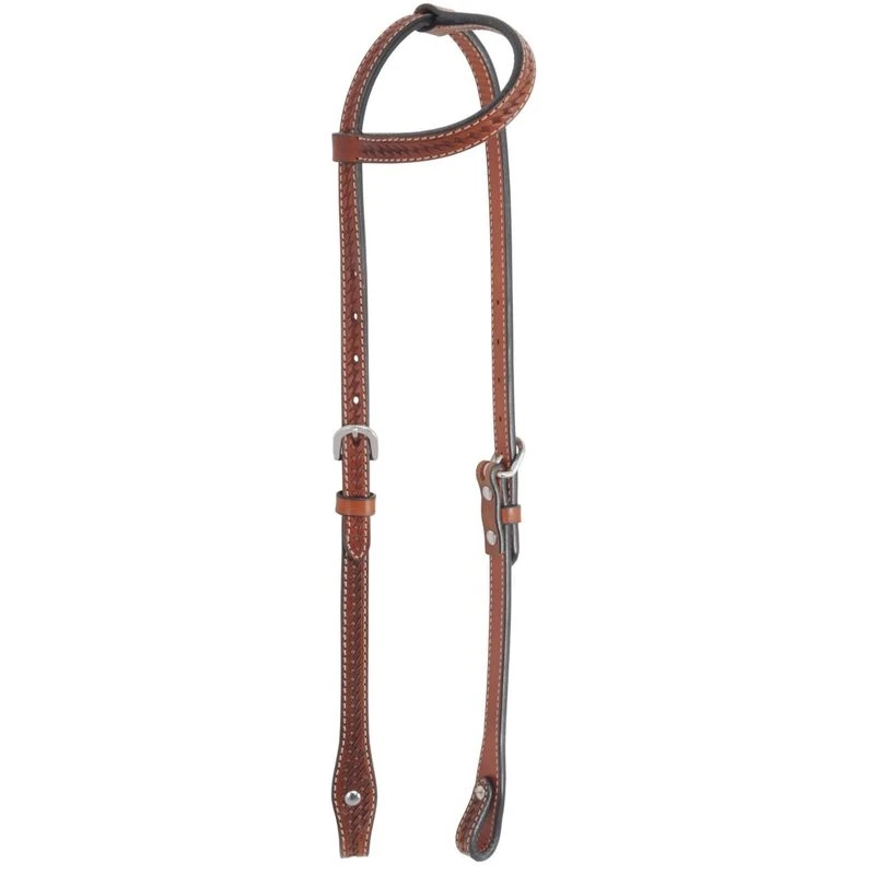 This single ear headstall is made with intricate basketweave tooling, contrast stitching and screws at bit ends. Crafted in long lasting, premium quality USA tanned leather.