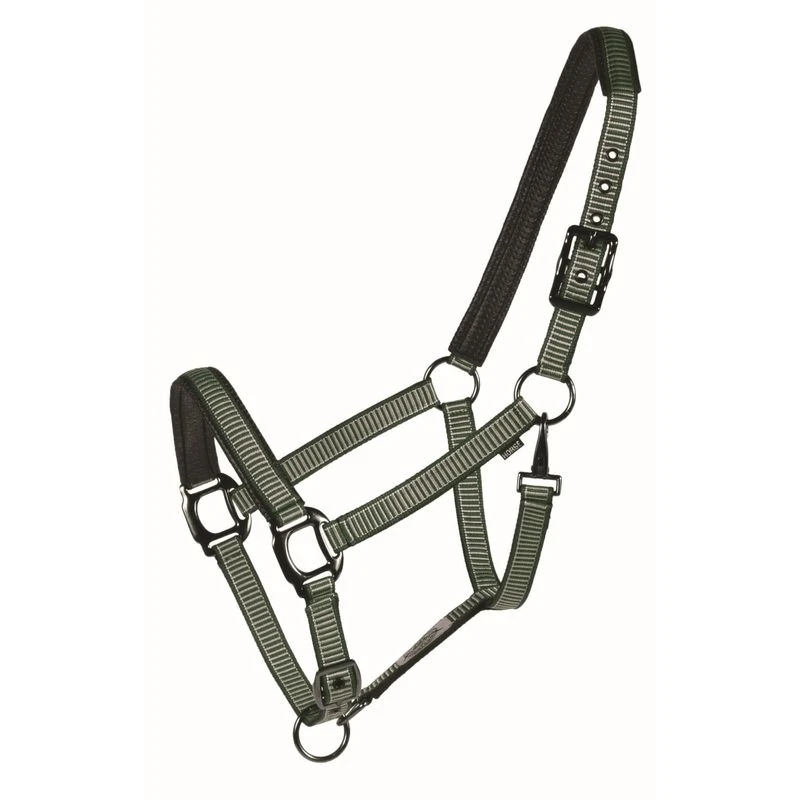 Stylish polypropylene web halter featuring contrasting stripes, shiny black hardware and PVC padding on crown and nose.